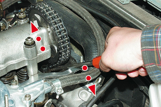 - Если цепная передача газораспределительного механизма получила достаточную натяжку, требуется плотно закрутить натяжитель цепи ГРМ и собрать навесное оборудование в обратном порядке.