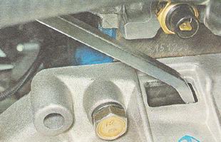 Ключом «на 13» отворачиваем два болта крепления кронштейна демпфера к картеру коробки передач.